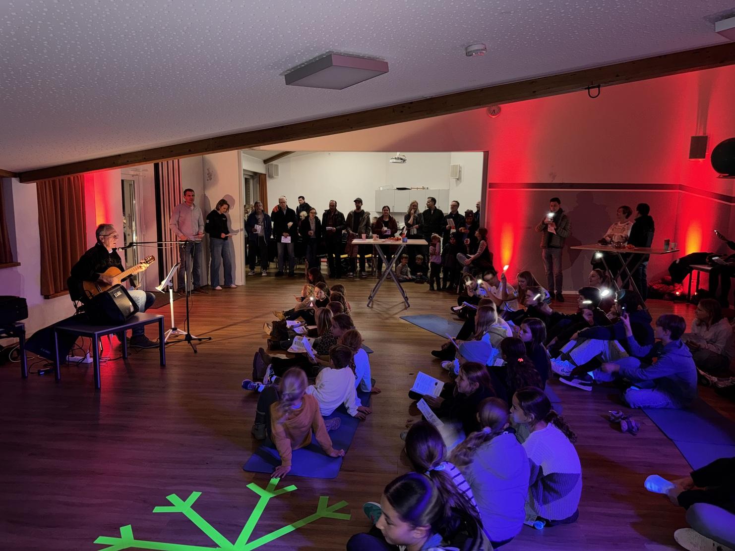 Mit seiner Gitarre stimmte Dr. Frank Schindelhauer zahlreiche Kinder und deren Eltern auf die Festtage ein. Der Handballnachwuchs zeigte sich bei Liedern wie „Feliz Navidad“ oder „In der Weihnachtsbäckerei“ sehr textsicher und konnte auch mit Weihnachtswünschen in verschiedenen Sprachen glänzen. Dank der tollen Klänge Schindelhauers und des lautstarken Gesangs der Kinder lag schon ein Hauch von Weihnachten im Kursraum in der Luft.