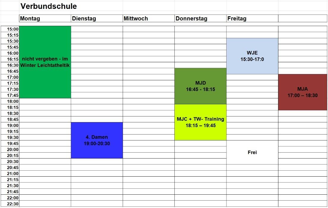 | Donnerstag | 18:15 – 19:45 | Handball: männl. Jugend C | Verbundschulhalle | ||||||||||||||||