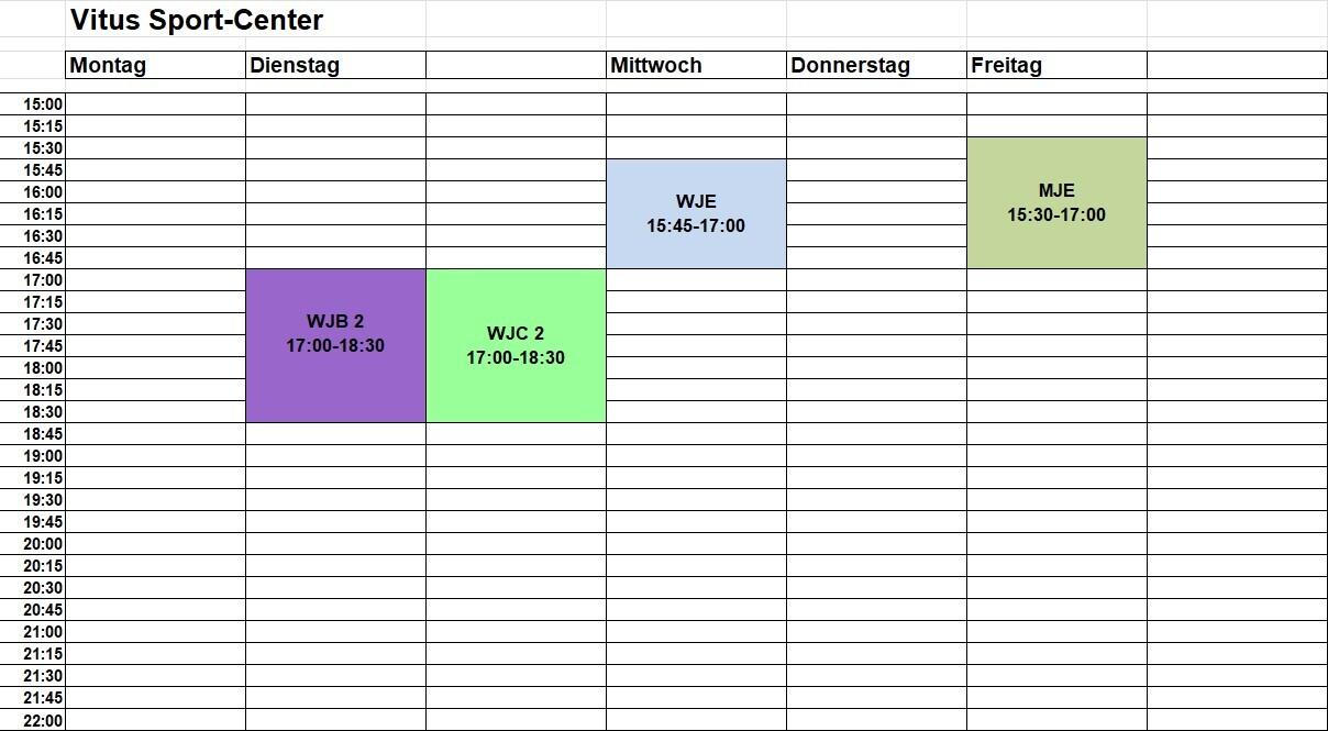 | Dienstag | 17:00 – 18:30 | Handball: weibl. Jugend C II | Vitus Sportcenter | ||||||||||||||||