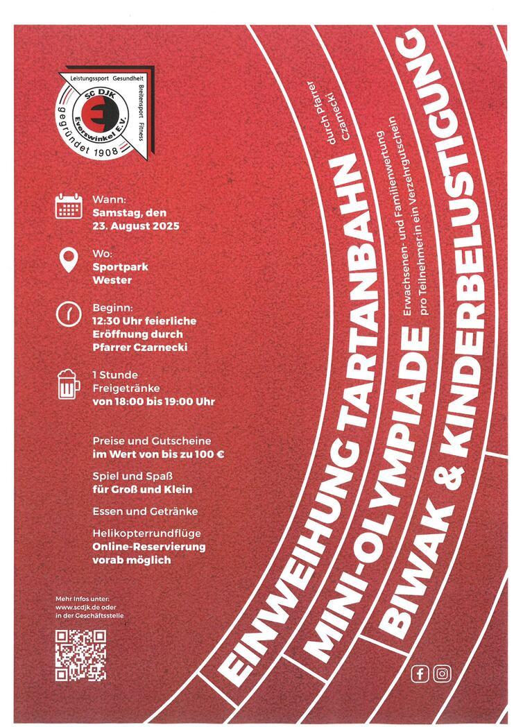 Anlässlich der Einweihung der neuen Tartanbahn möchte der SC DJK Everswinkel alle Bürgerinnen und Bürger am 23. August einladen zum Sportpark Wester zu kommen.