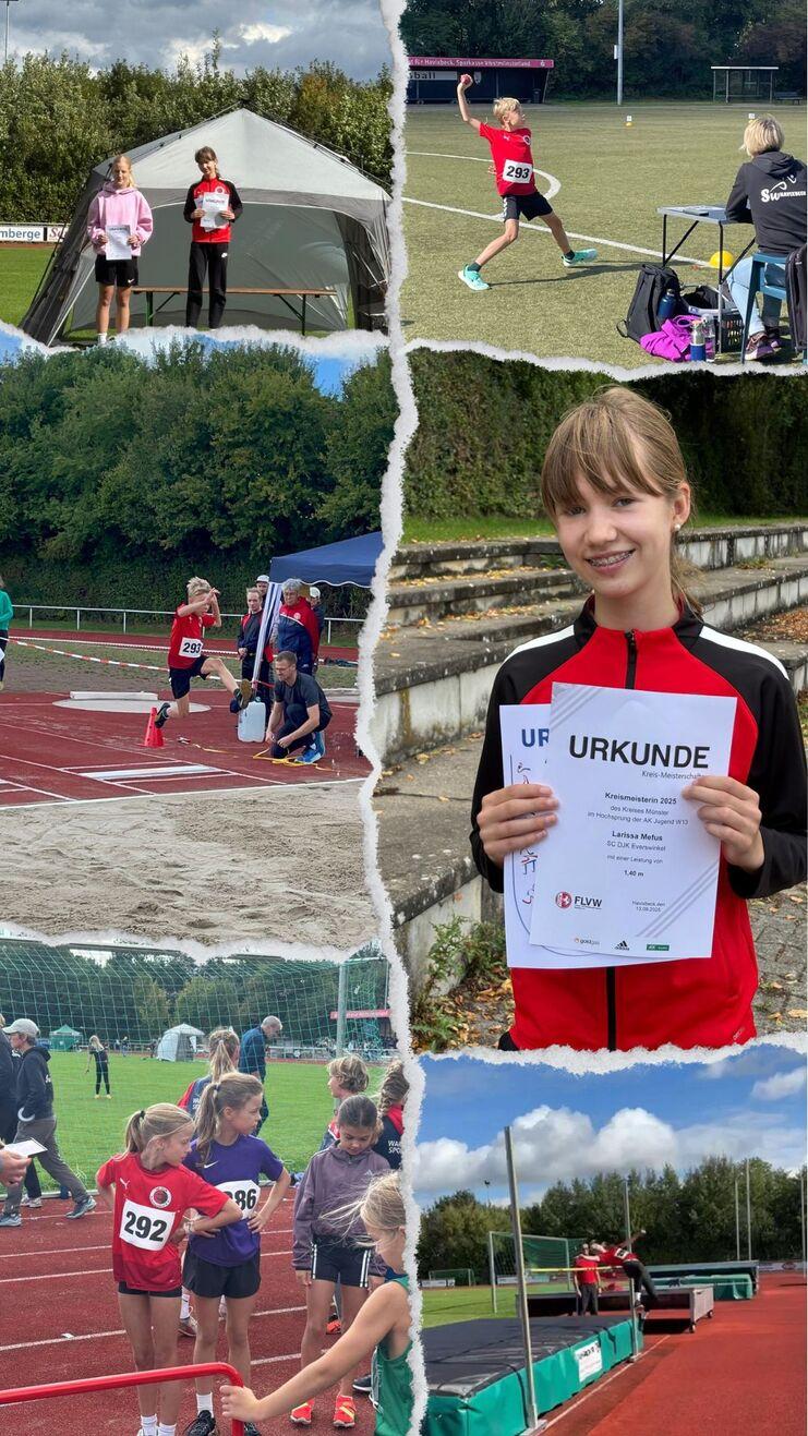 Larissa zeigte sich an diesem Tag von ihrer besten Seite und schockte Trainer und Eltern mit exzellenten Lattenüberquerungen im Hochsprung beim ersten Versuch. Bis es an den 1,44m scheiterte, konnte sie somit das Jahresziel von Trainer Dominik schon an diesem Tag erreichen und verbesserte ihre persönliche Bestleistung um 10cm auf 1,40m! Somit kann sie sich Kreismeisterin im Hochsprung der U14 in diesem Jahr nennen! Auch im Ballwurf zeigte sich ihre hervorragende Technik, wodurch sie mit spontaner Umstellung auf einen Anlauf mit zyklischem Teil den Ball auf 29,50m beförderte.