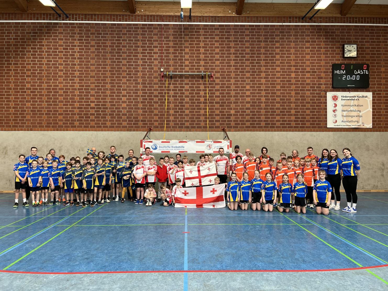 Beim Einzug der Mannschaften freuten sich natürlich alle Kinder besonders über ihre neuen Nationaltrikots. Auch auf der Tribüne waren die Eltern mit Fahnen, Kostümen und Trommeln ausgestattet. Die gemischte E-Jugend des SC DJK Everswinkel trug die Farben Bosnien-Herzegowinas. Im ersten Spiel teilte sich das Team die Punkte beim 11:11 mit Georgien (Vorwärts Gronau). Anschließend verlor die Truppe in packenden Partien gegen Schweden (Westfalia Kinderhaus) mit 8:10 und gegen den souveränen Gruppesieger Niederlande (JSG Tecklenburger Land) mit 10:13. Schweden erkämpfte sich in der spannenden letzten Begegnung vor Georgien (11:11) den zweiten Platz.